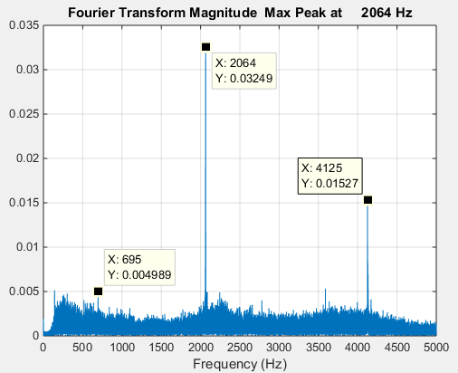 A Fourier transform was applied to the sound time history. The Y-axis is unscaled sound pressure. The steady-state portion yielded a spectral line near 700 Hz which corresponds to the rotor speed of 42,000 RPM, Harmonics are also present at 3X & 6X.
