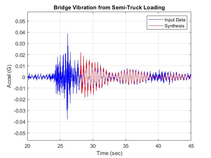 The figure below shows a bridge response acceleration time history as measured on an Android Smartphone, vertical axis. The excitation was primarily due to a single semi-truck, with some small passenger cars also contributing.