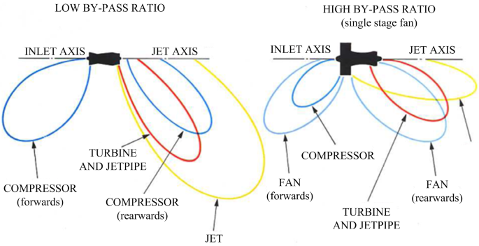 A jet engine directivity diagram is shown below. Assume that these are for a given frequency.