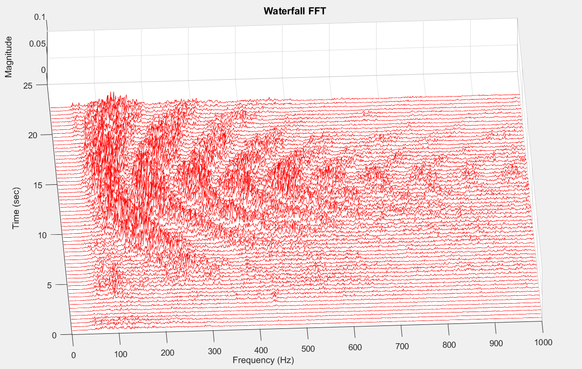 Most of the takeoff noise is due to the Boeing 737-800’s two CFM56-7B turbofan engines. Turbulent airflow over the airframe is another source. I extracted the audio signal from the video and performed a Waterfall FFT as shown below. The data appears to be swept narrowband random at first glance. But the frequency shifts are too large for a simple Doppler shift. Furthermore, the narrowbands are sweeping upward in frequency as the aircraft flew away from me past the 15 sec mark, contrary to the Doppler principle. Audio Link