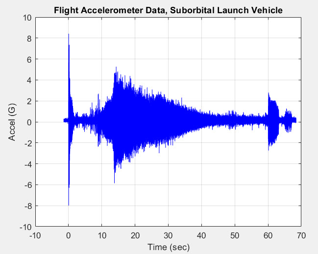 I also took some nonstationary flight accelerometer data from an unmanned, suborbital launch vehicle, as shown in the figure above. The data had 453,250 points. I multiplied the amplitude by one million to achieved the desired multiple orders of magnitude effect. The nonstationary results had good agreement with Benford.
