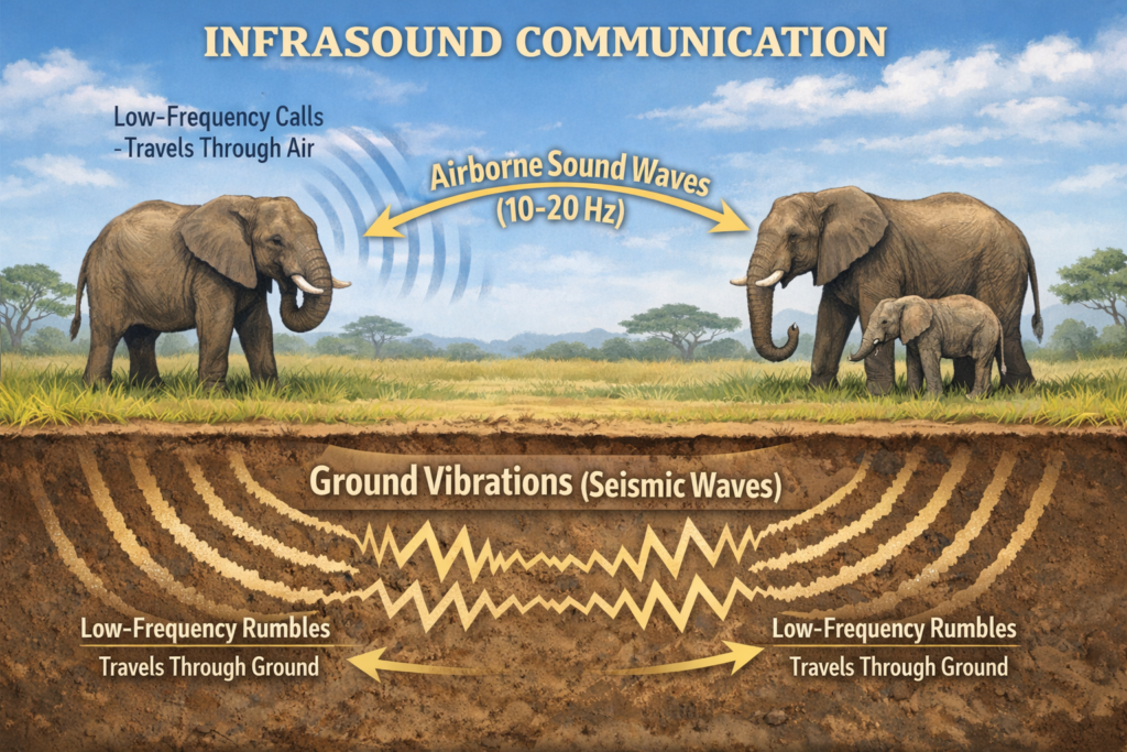 Here’s where elephant communication gets really fascinating: the same low-frequency rumble can also create vibrations that travel through the ground.